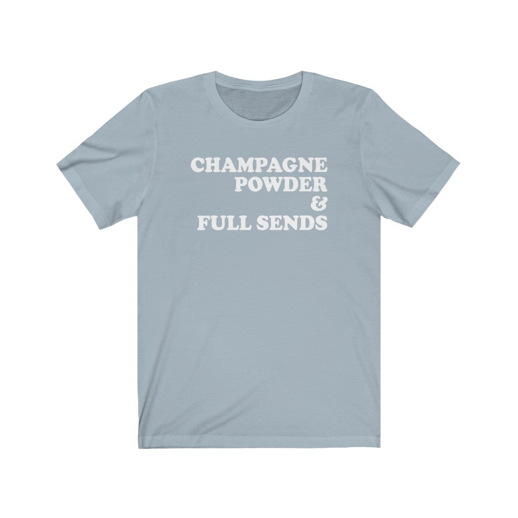 Champagne Powder & Full Sends T-Shirt is the epitome of an excellent wardrobe choice. Crafted from the finest grade of cotton, it offers a luxurious feel that is soft, lightweight, and comfortable.Designed with a classic style featuring a crew neckline, short sleeves, and an easy regular fit, it guarantees breathability and absorbency for enduring comfort and durability. Moreover, it comes in an array of colors to suit your preferences.