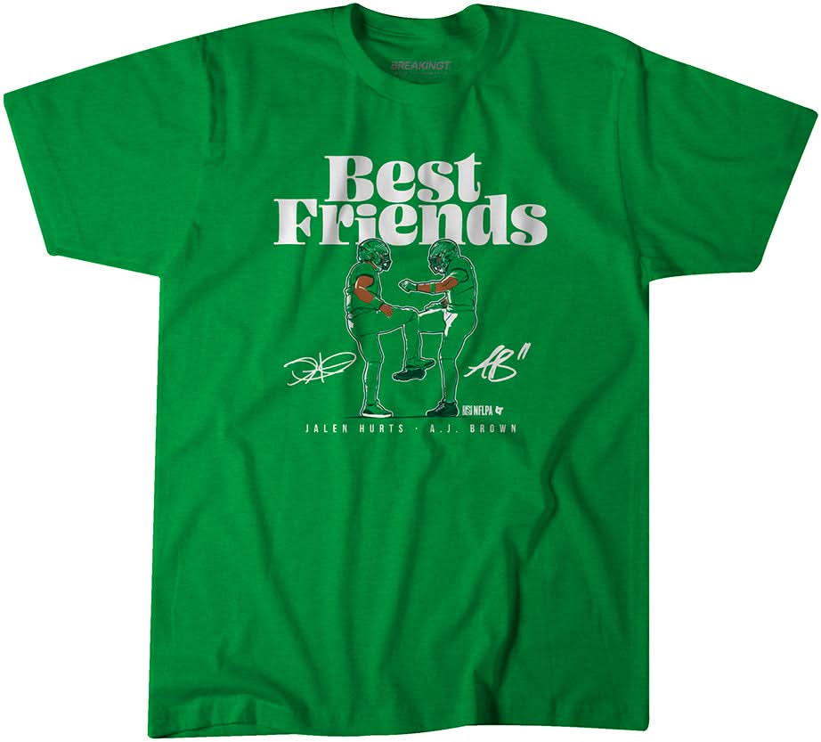 Jalen Hurts & A.J. Brown Best Friends is the epitome of an excellent wardrobe choice. Crafted from the finest grade of cotton, it offers a luxurious feel that is soft, lightweight, and comfortable.Designed with a classic style featuring a crew neckline, short sleeves, and an easy regular fit, it guarantees breathability and absorbency for enduring comfort and durability. Moreover, it comes in an array of colors to suit your preferences.